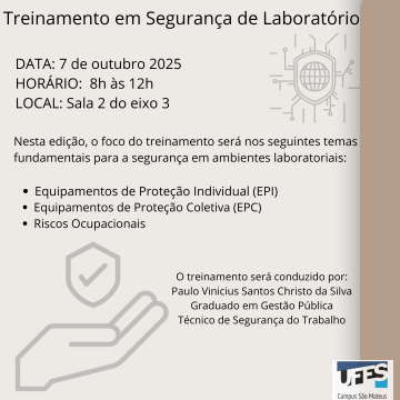 A Diretoria de Atenção à Saúde da PROGEP (DAS/Progep), em parceria com a Divisão de Atenção à Saúde e Assistência Social (DASAS/Ceunes) e o Departamento de Ciências Naturais (DCN/Ceunes), convida toda a comunidade acadêmica a participar do Treinamento em Segurança de Laboratório, que será realizado no dia 7 de outubro de 2025, das 8h às 12h, na sala 02 do eixo 3.